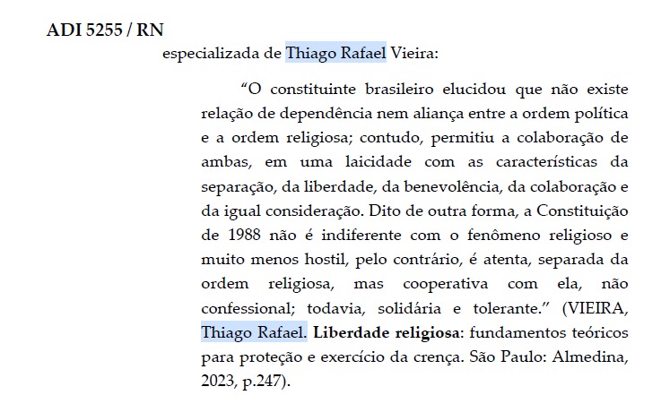 A voz do Direito Religioso ecoa no STF: obra de Thiago Rafael Vieira é mencionada em voto do Ministro André Mendonça